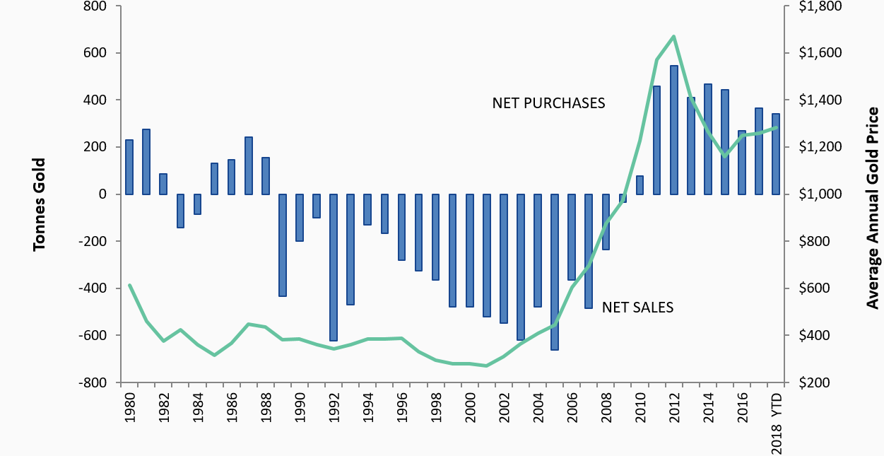2018 is shaping up to be another year of strong gold demand from central banks. The chart shows central banks on track to purchase over 400 tonnes this year.
