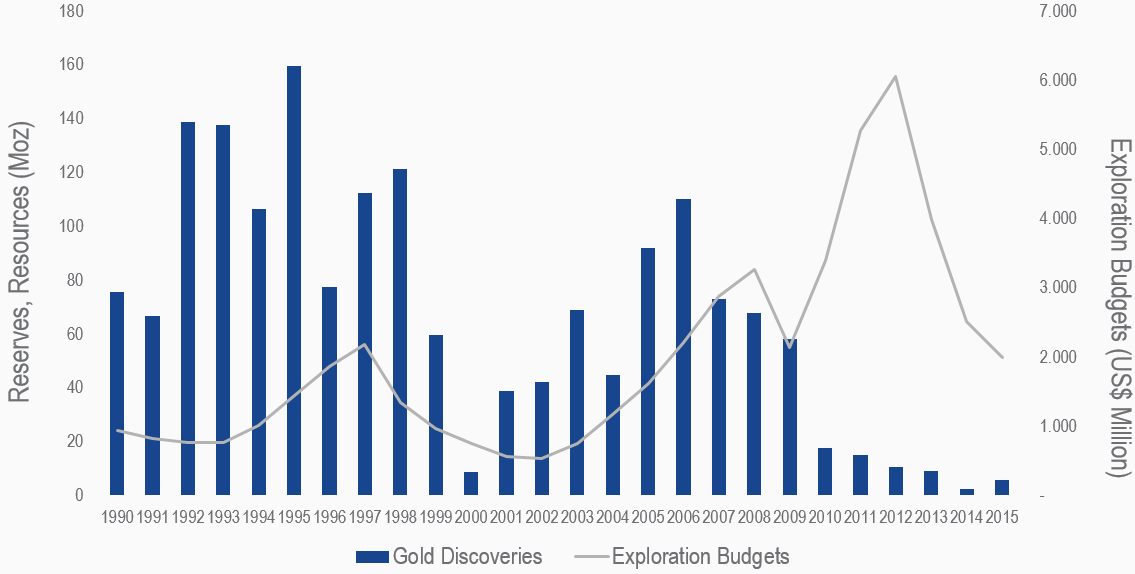 Most industry analysts have gold production peaking in the 2017–2020 period with no increase likely in the foreseeable future. This spells an end to the roughly 2.5% average annual production growth that has gone on for decades. The reason for the lack of growth is that most of the relatively easy to locate, near-surface gold deposits have been found and the industry has been unable to find any new prolific districts, akin to those of South Africa, Nevada, or Western Australia.
