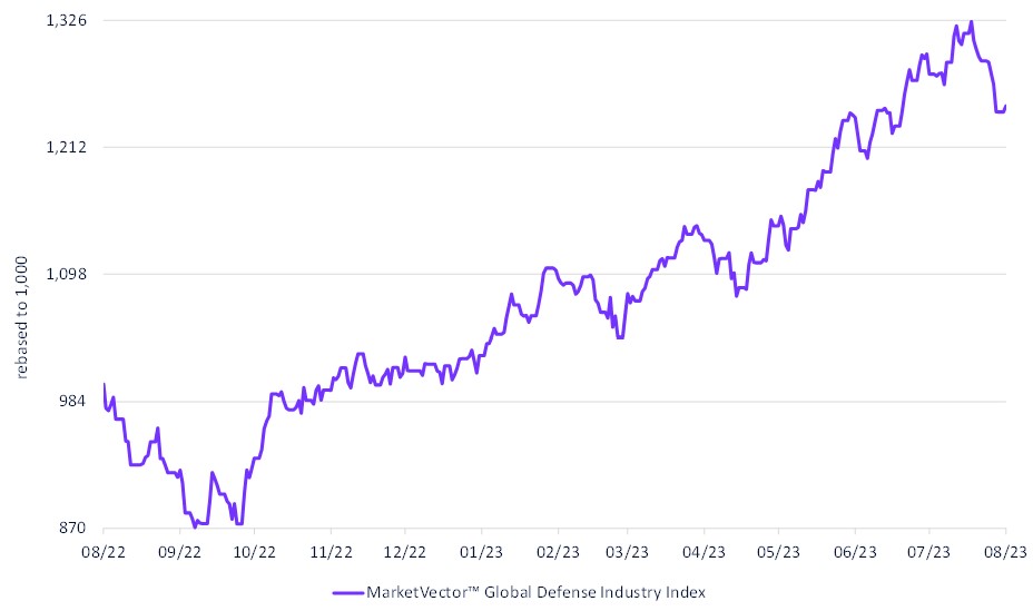 The MarketVectorTM Global Defense Industry Index (MVDEF) tracks the performance of companies that are involved in serving national defense industries. The index has exhibited strong performance YTD, having appreciated over 23% as of August 18, 2023. The index distinguishes itself by exclusively targeting pure-play defense firms, without any emphasis on civil and commercial aviation, recreational firearms, or similar non-military-related fields.
