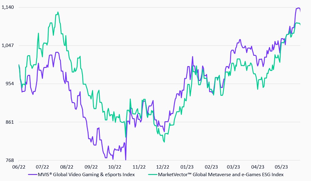 The MVIS® Global Video Gaming & eSports Index (MVESPO) tracks the performance of the largest and most liquid companies in the global video gaming and eSports industries, and the MarketVectorTM Global Metaverse and e-Games ESG Index (MVMETV) tracks the performance of global companies involved in technologies and services related to the metaverse, e-gaming, and eSports industries. Both indexes have exhibited strong YTD performance (as of June 26, 2023) propelled by the prominence of artificial intelligence.