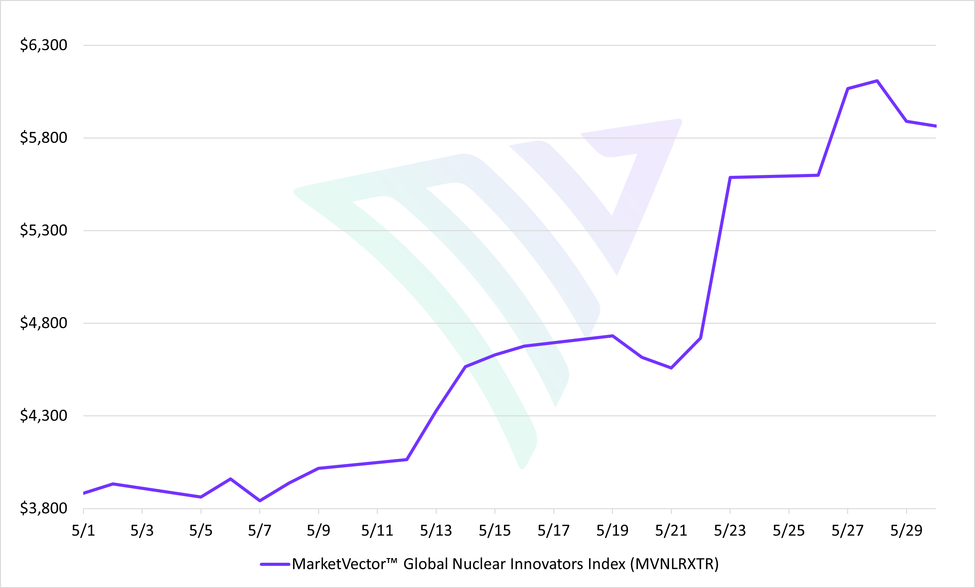 The MarketVector™ Global Nuclear Innovators Index (MVNLRXTR) delivered a standout performance in May, soaring +56% in May as nuclear energy regained center stage.