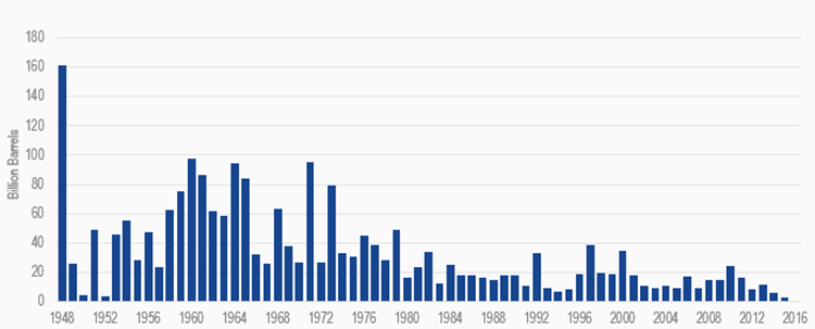 Note: 2016 Figure covers exploration results to August. Discoveries amount to just 230 million barrels in 1947 but ballooned the following year with the Ghawar find in Saudi Arabia, still the world's biggest field.