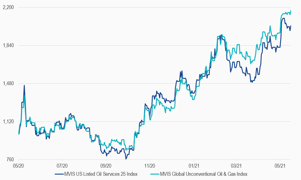 This upward trend can be seen in the two indices — the MVIS US Listed Oil Services 25 Index (ticker: MVOIH) and the MVIS Global Unconventional Oil & Gas Index (ticker: MVFRAK).