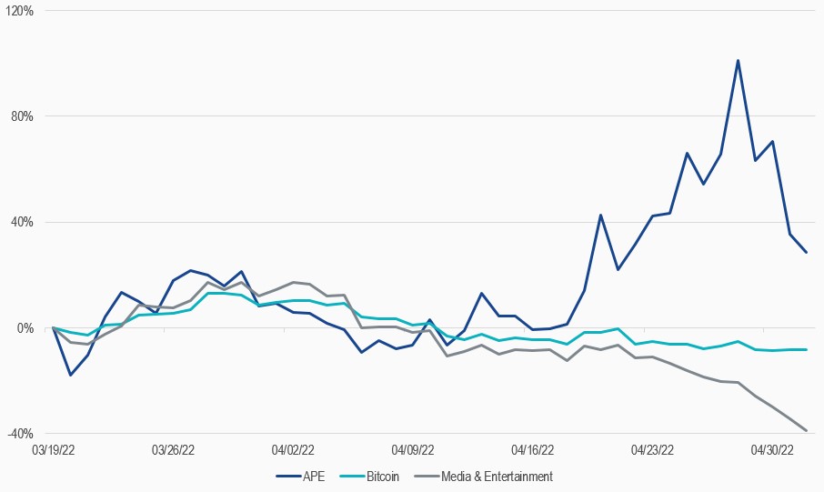 As you can see in Exhibit 1, APE decoupled strongly from our Media & Entertainment Index. It outperformed Bitcoin in a falling market environment. But you can see the speculative character as well. In the last three days, APE lost more than 50%.