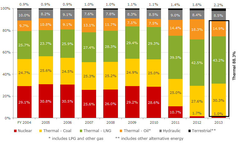 Two days later, the Chairman of the Federation of Electric Power Companies of Japan disclosed that thermal power accounted for 88.3% of Japan's electrical output for the year ended March 2014. The fuel cost for electrical power generation in Japan more than doubled since the Fukushima accident in May 2011.