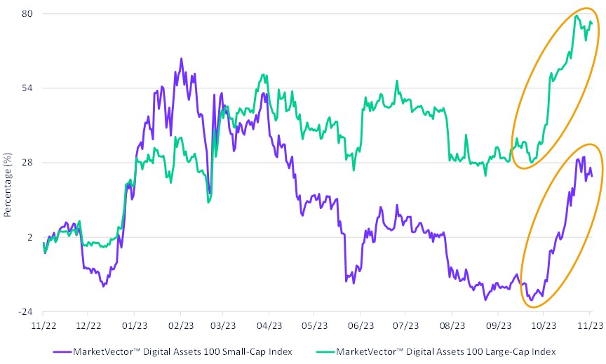 Contrary to the usual trend of large-cap tokens outperforming smaller ones, there's been a significant shift in the market. Recent data, particularly the performance of the MarketVectorTM Digital Assets 100 Large-Cap Index (MVDALC) versus the MarketVectorTM Digital Assets 100 Small-Cap Index (MVDASC), reveals insightful trends. Since the banking crisis in March, large-cap tokens have been increasing. However, in the last four weeks, there's been a notable shift, signaling a rotation into smaller altcoins.