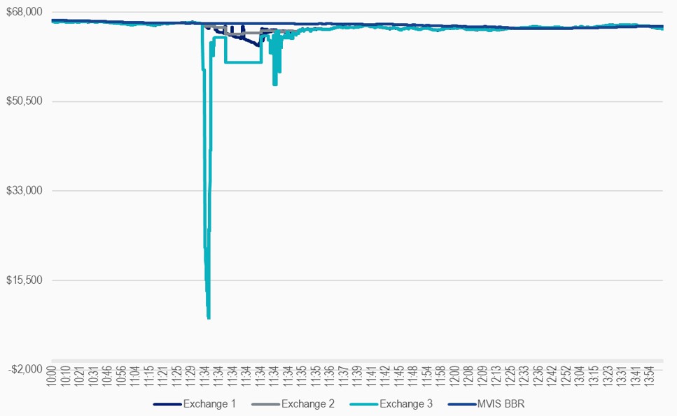 On October 21, 2021, a flash crash on one Bitcoin exchange caused Bitcoin’s price to plunge from $66,000 to $8,000 and bounce back to $65,000 within seconds, while it remained steady across other Bitcoin exchanges. The cause was reportedly due to a “bug in the trading algorithm”. Throughout the day, the MVIS CryptoCompare Bitcoin Benchmark Rate (BBR), maintained reliability in Bitcoin price.