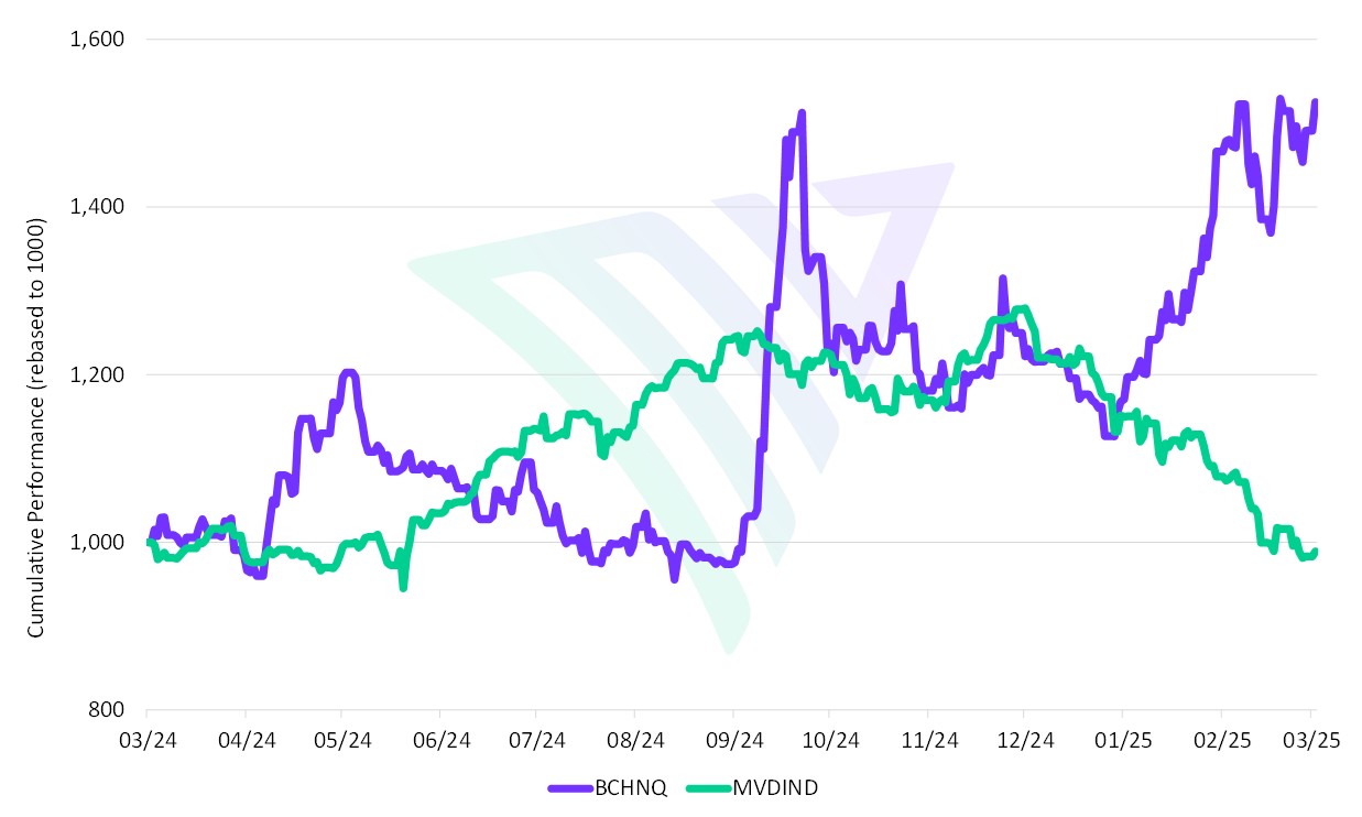 While the US looks expensive, the aggregate World MC/GDP ratio is close to it’s long term average since 2000, indicating that there are other parts of the world that might look cheap. China is one country below it’s average and lower than the rest of the world; india is one country above it’s average and higher than the restor of the world. Comparing BlueStar® China Internet Software Index (BCHNQ) to MVIS® Digital India Index (MVDIND), we can see that BCHNQ has outperformed MVDIND over the last year (since March 16, 2024). This resurgence signals renewed investor interest, placing China back on the opportunity radar as a potential value play in global markets.
